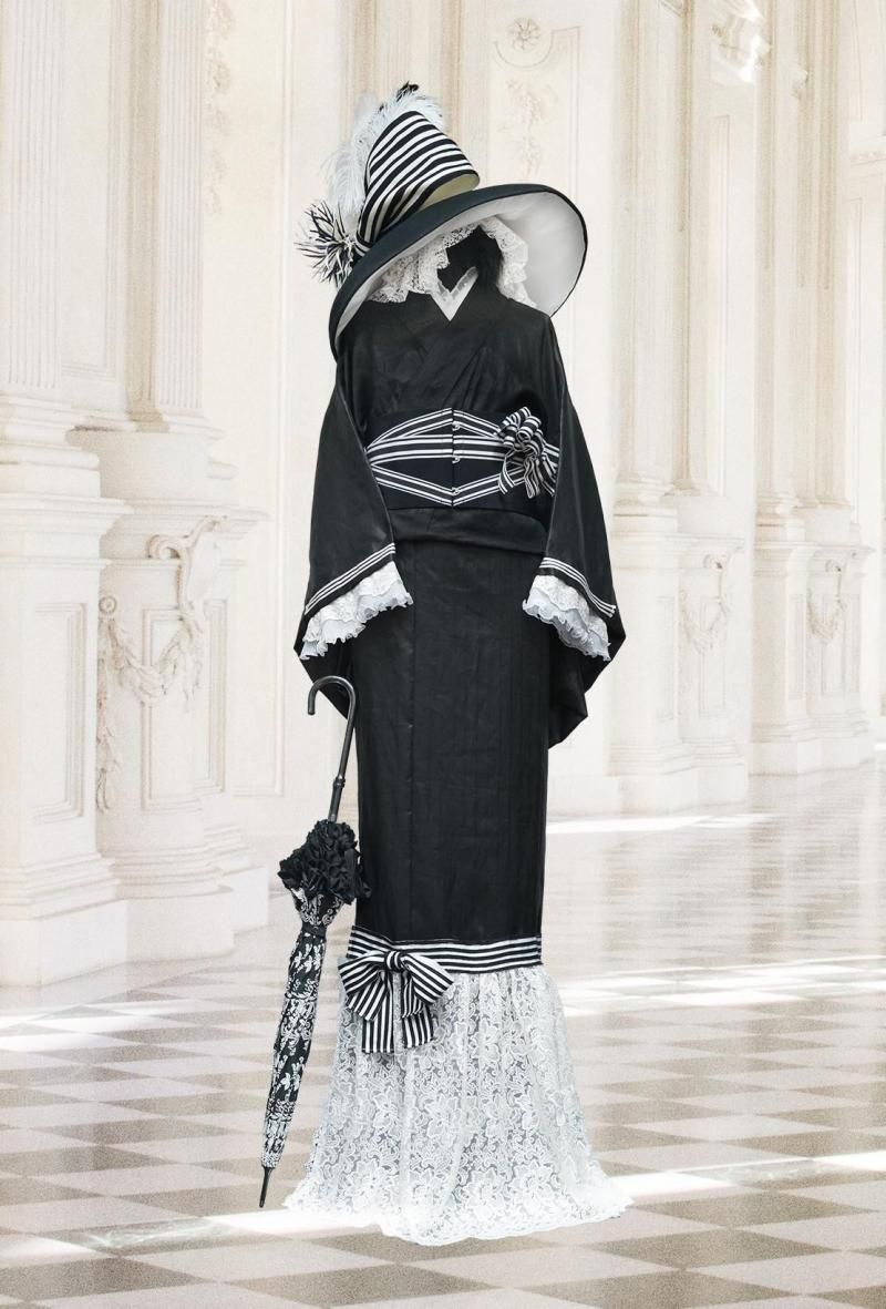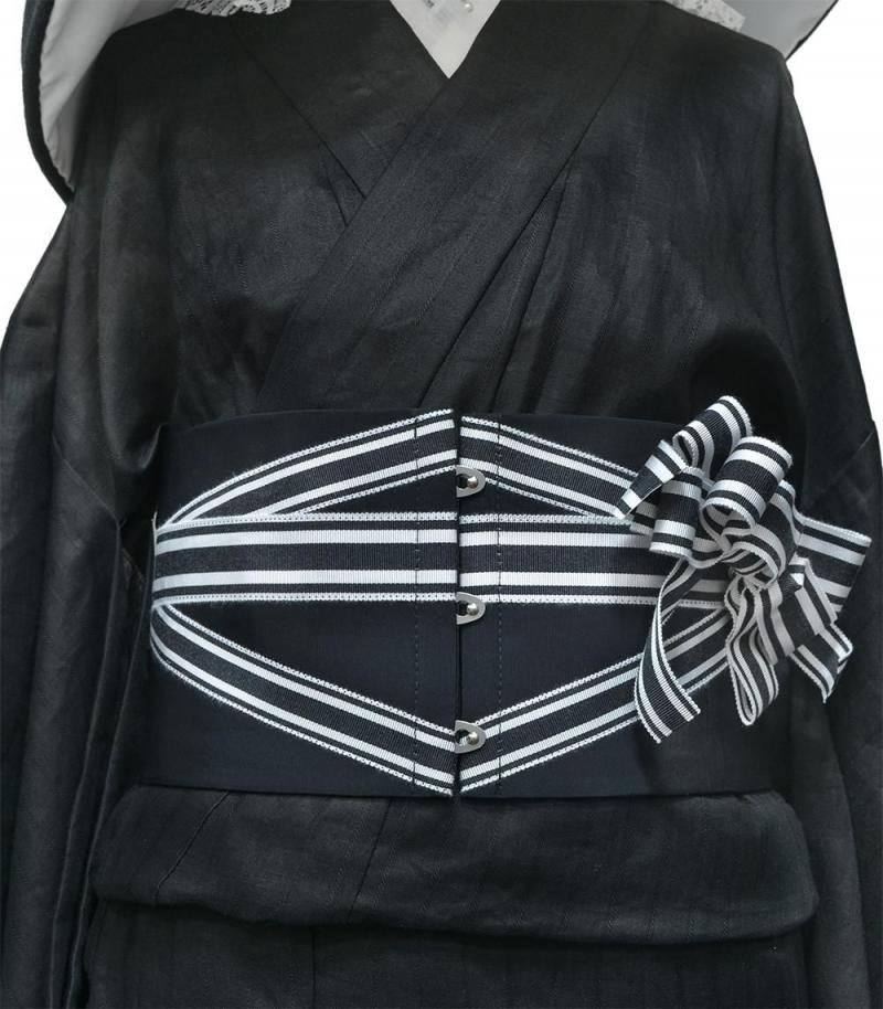 正絹帯地にストライプのリボンを叩きつけ、共リボンのコサージュをつけたモノトーンシックな帯コルセット。
